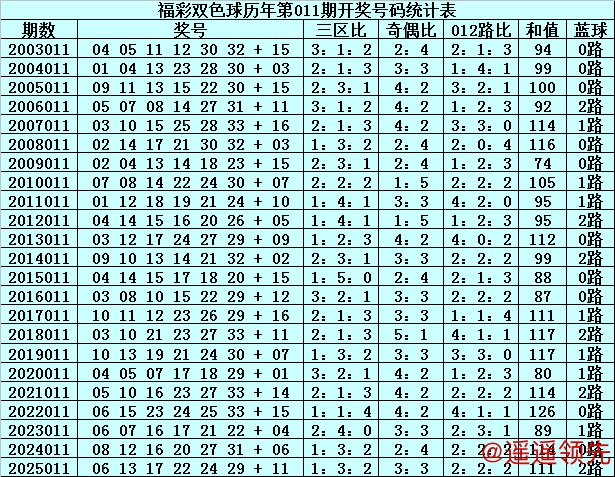 在第011期历史同期奖号中,红球三区分布总比例为41:54:43,奇偶总比例为69:69,012路比为51:42:45,和值分布在74-126之间,蓝球号码012路总比例为10:7:6。